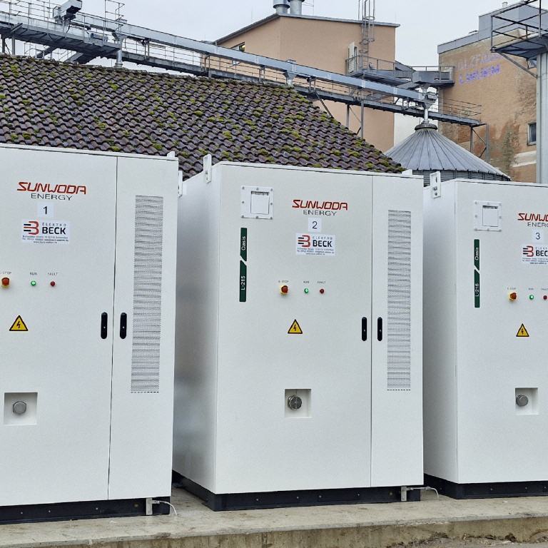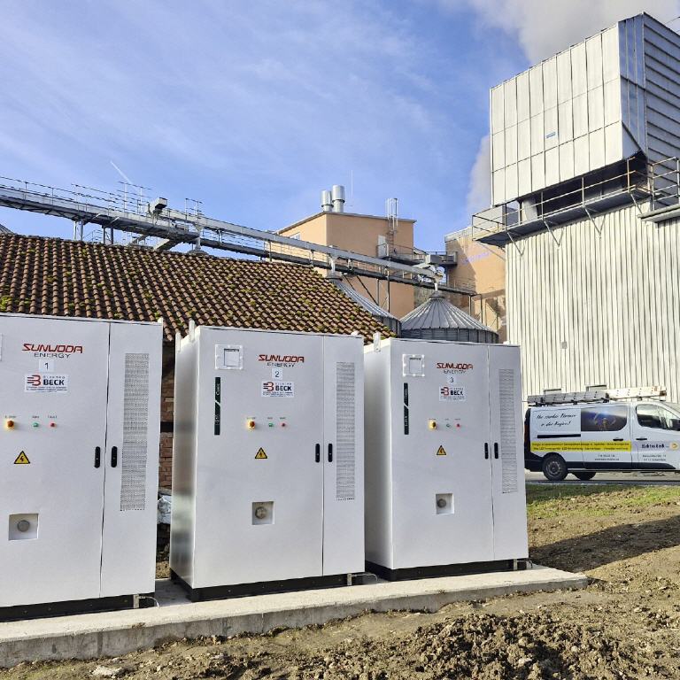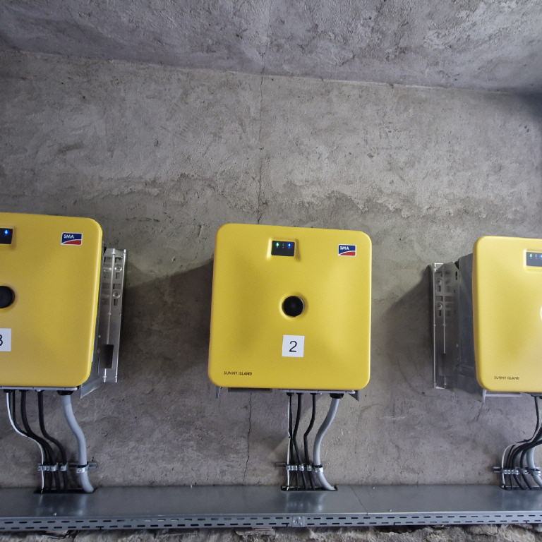 Installiert wurden drei SMA Sunny Island 50 kW sowie drei Sunwoda Oasis Batteriespeicher à 215 kWh. -